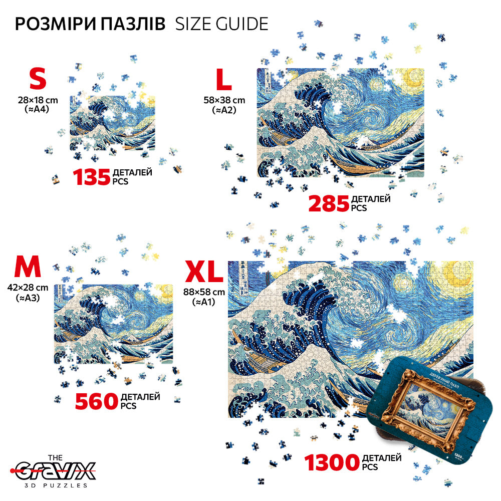 Puzzle łączą legendarną „Wielką Falę w Kanagawie” Hokusai’a 🌊 z magicznie wirującym niebem Van Gogha 🌌.